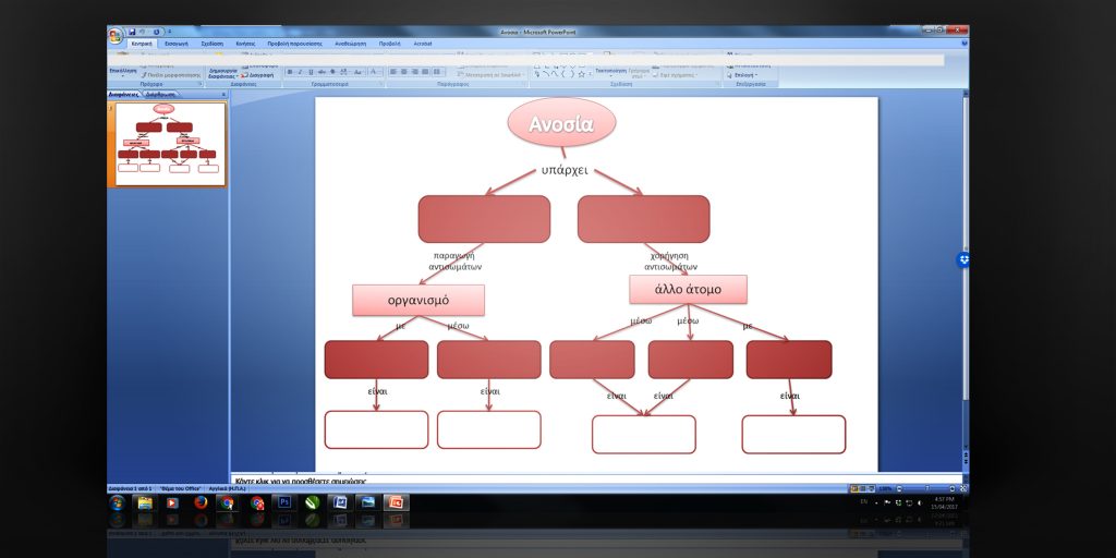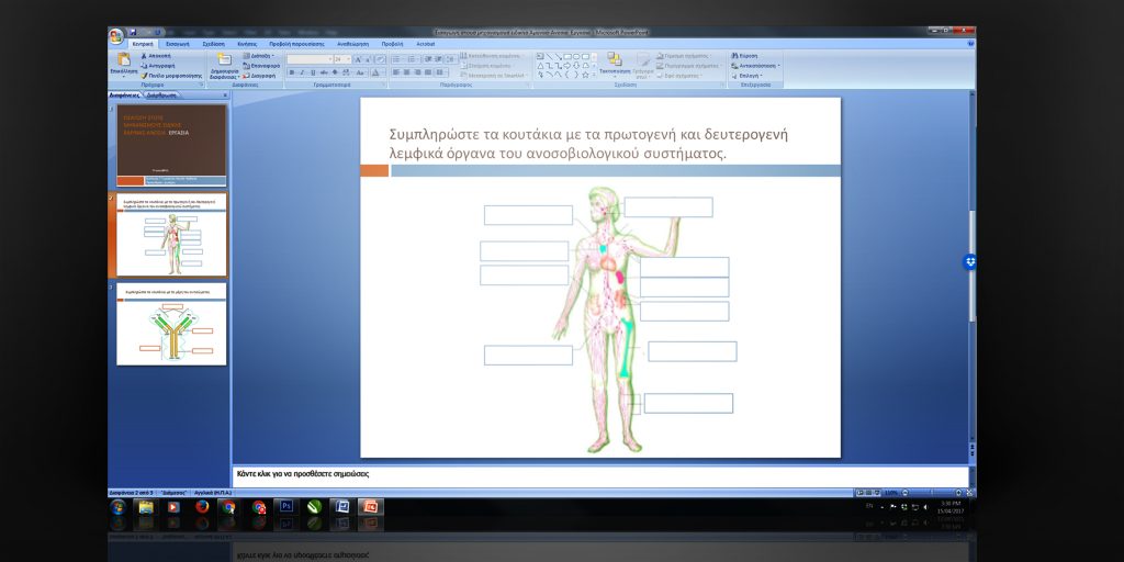 Έπειτα, παρακολουθούν δύο παρουσιάσεις Power Point που τους παρέχουμε. Η πρώτη αναφέρεται στα λεμφικά όργανα ενώ η δεύτερη στα αντισώματα.