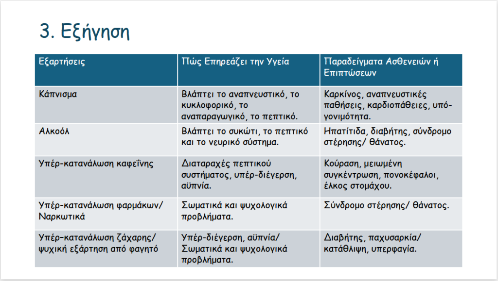 Παρακάτω παρουσιάζεται σε powerPoint μια προτεινόμενη διδασκαλία που δημιουργήσαμε εγώ και η συμφοιτήτριά μου Αγγελική Τσακατούρα, με θέμα “Τρόπος Ζωής και Ασθένειες”, βασισμένη στο Μοντέλο 5Ε, με στόχο την ενεργητική συμμετοχή των μαθητών και την κατανόηση της σχέσης των καθημερινών συνήθειών με την υγεία.