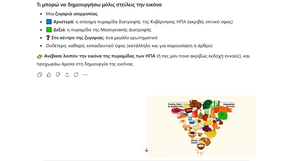 Χαρακτηριστικό παράδειγμα εφαρμογής αποτελεί η δημιουργία εικόνας που συγκρίνει τη Νέα Διατροφική Πυραμίδα της Κυβέρνησης των Ηνωμένων Πολιτειών με τη Μεσογειακή Διατροφή. Με τη χρήση ενός κατάλληλου prompt, ο χρήστης μπορεί να ζητήσει την παραγωγή μιας εικόνας όπου απεικονίζονται δύο διατροφικές πυραμίδες τοποθετημένες πάνω σε μια ζυγαριά, με τη μεσογειακή πυραμίδα να περιλαμβάνει τρόφιμα όπως το ελαιόλαδο, τα λαχανικά, τα όσπρια και το ψάρι, και τη διατροφική πυραμίδα των ΗΠΑ να βασίζεται στις σύγχρονες επίσημες διατροφικές οδηγίες. Η προσθήκη ενός ερωτηματικού ανάμεσα στις δύο απεικονίσεις ενισχύει τον προβληματισμό και ενθαρρύνει τη συγκριτική σκέψη, αναδεικνύοντας πώς η τεχνητή νοημοσύνη μπορεί να λειτουργήσει ως εργαλείο διερεύνησης και όχι απλής παροχής απαντήσεων.