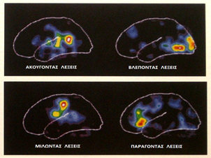 4. Μέσω διαφόρων τεχνικών και με τη βοήθεια της τρισδιάστατης απεικόνισης παρατηρείται ότι κάθε φορά που ο ανθρώπινος εγκέφαλος εκτελεί διαφορετικές ενέργειες, εντοπίζεται δραστηριότητα σε διαφορετικές περιοχές του (το πορτοκαλί χρώμα δείχνει την περιοχή ενεργοποίησης του εγκεφάλου σε κάθε συγκεκριμένη περίπτωση).