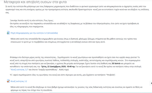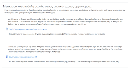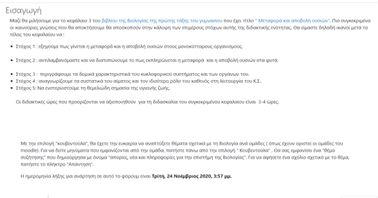 Αρχικά, το κεφάλαιο με το οποίο ασχολήθηκα προσωπικώς και έχτισα για αυτό ένα περιβάλλον ηλεκτρονικού μαθήματος, είναι το κεφάλαιο 3 του βιβλίου της πρώτης γυμνασίου με τίτλο « Μεταφορά και αποβολή ουσιών». Πιο συγκεκριμένα, οι ενότητες τις οποίες παρέθεσα στο Moodle είναι οι εξής: