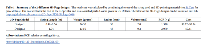 •αυτό το τρισδιάστατο τυπωμένο όργανο είναι ικανό να συγκρατεί και να περιστρέφει 4 δείγματα, ενώ αυξάνει την χωρητικότητα του όγκου των σωληνών στα 2 mL (εν αντιθέσει με την χάρτινη φυγόκεντρο ➸ 20 μL ανά τριχοειδή σωλήνα ) και μπορεί να φτάσει σε ταχύτητες φυγοκέντρησης έως και 6.000 σ.α.λ.