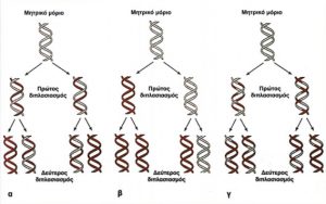 3) Η κάθε μία από τις αλυσίδες του μητρικού αυτού μορίου χρησιμεύει ως καλούπι για τη σύνθεση μιας συμπληρωματικής νέας αλυσίδας.