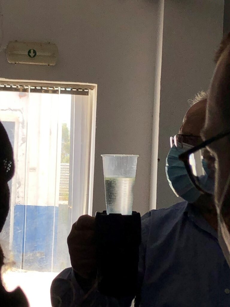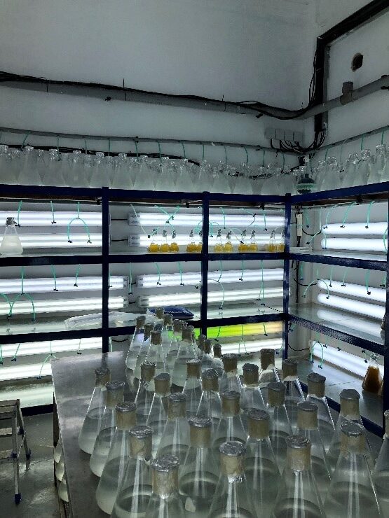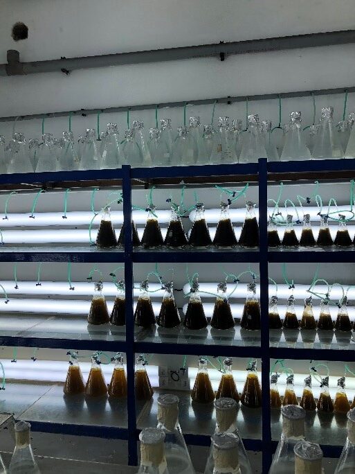 Εικόνες 12, 13, 14: Καλλιέργεια φυτοπλαγκτού με τεχνητό λευκό φως εντός του σταθμού για τη χρήση του ως τροφή. Παρατηρούμε τα δύο είδη φυτοπλαγκτού, το πράσινο και το καφέ. Το χρώμα της καλλιέργειας διαφέρει ανάλογα την πυκνότητα/συγκέντρωση του φυτοπλαγκτού.