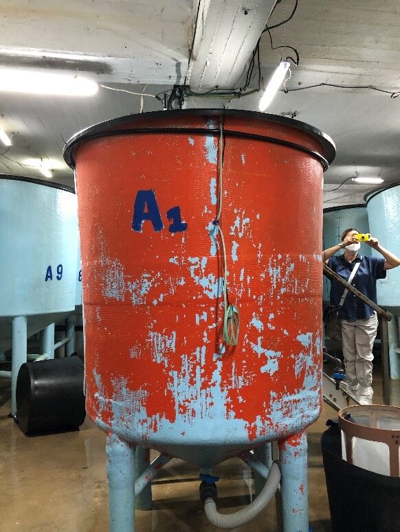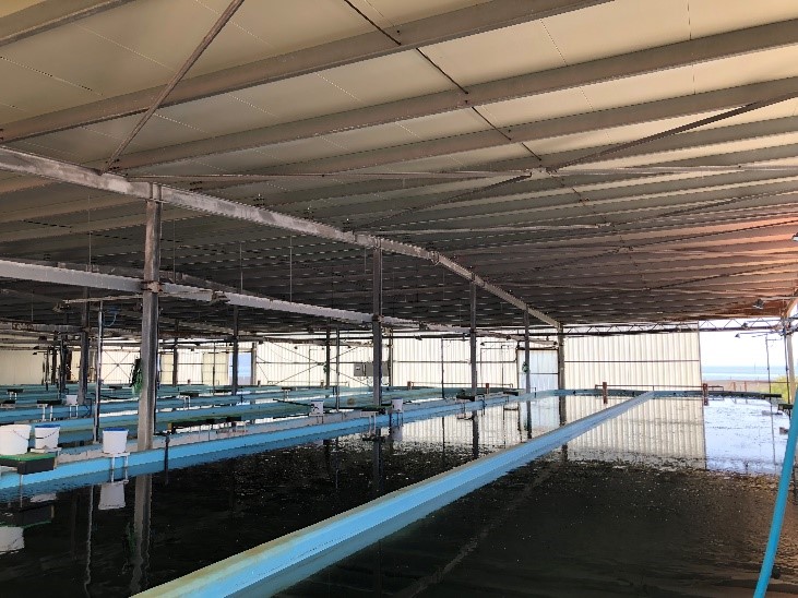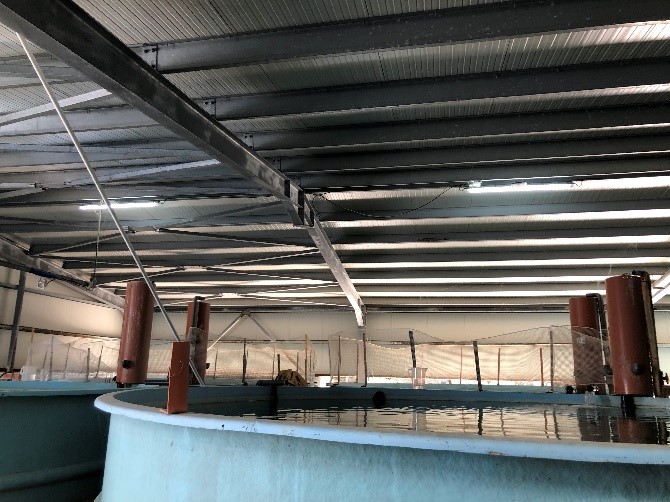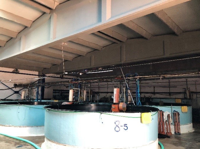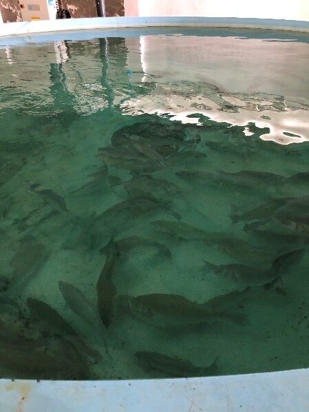 Εικόνα 23 και 24: Πάχυνση ιχθυδίων σε εξωτερικές δεξαμενές με στέγαστρο. Πραγματοποιείται συχνή διαλογή μεγεθών τόσο για τη μεταφορά τους στις δεξαμενές προπάχυνσης ή πάχυνσης όσο και για την πρόληψη επιθετικών συμπεριφορών μεγάλων προς μικρότερων ιχθυδίων.