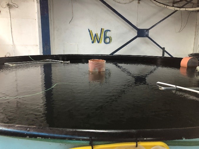 Εικόνα 3: Στη μέση της δεξαμενής παρατηρείται ένα δίχτυ από το οποίο διέρχονται μεταβολικά προϊόντα και περιττές ουσίες ή υπολείμματα τροφής αλλά όχι τα ιχθύδια. Ανάλογα το στάδιο του ιχθυδίου μεταβάλλεται και η διάμετρος των πόρων του διχτυού.