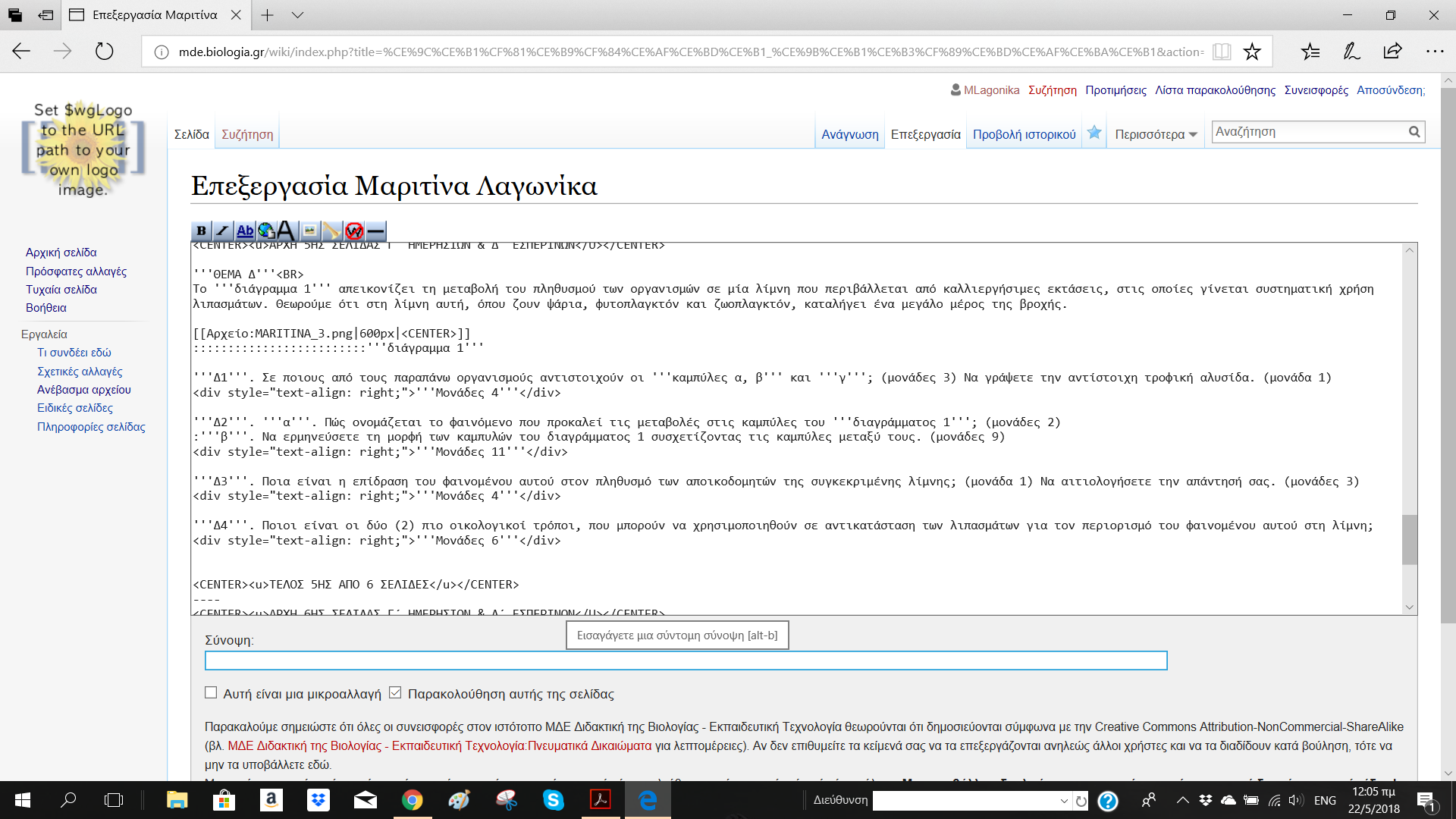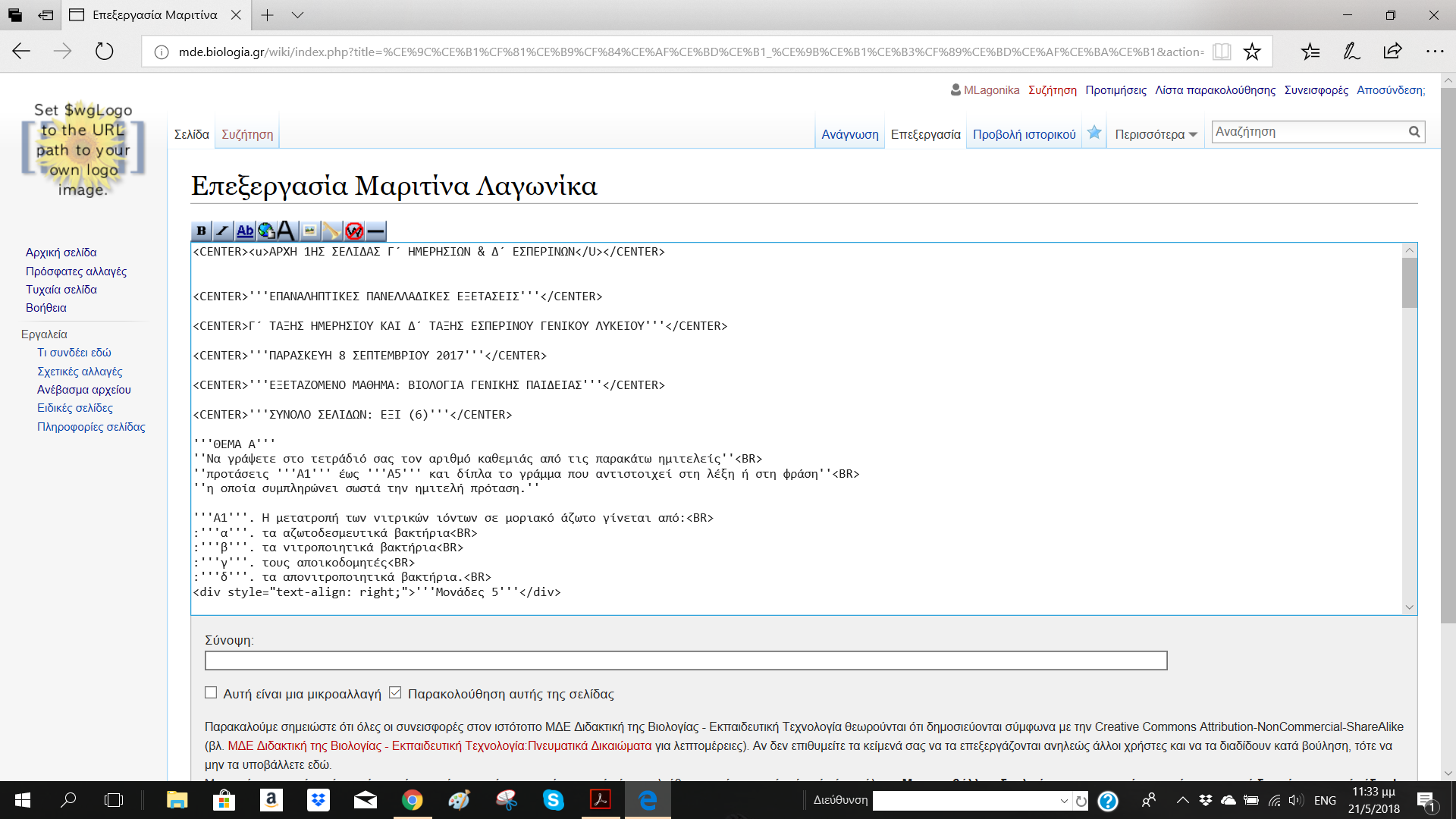 Στα πλαίσια του μαθήματος Εκπαιδευτική Τεχνολογία δημιουργήσαμε μια σελίδα wiki προκειμένου να εξασκηθούμε στη χρήση του κώδικα. Συγκεκριμένα, μου δόθηκαν τα θέματα των επαναληπτικών πανελλαδικών εξετάσεων εσπερινών Λυκείων Βιολογίας Γενικής Παιδείας Σεπτεμβρίου 2017.