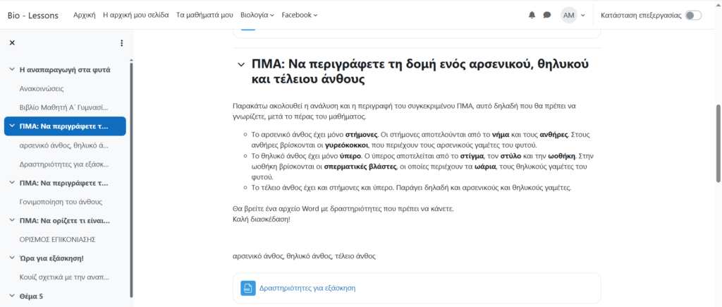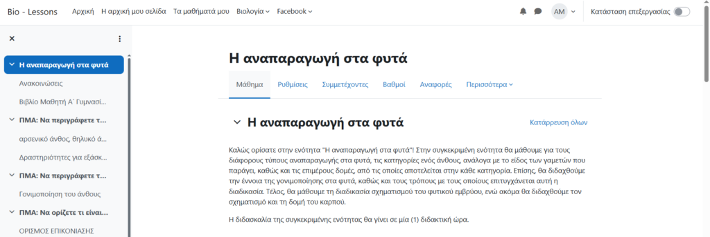 Στα πλαίσια του μαθήματος Ψηφιακός Μετασχηματισμός – Νέες Τεχνολογίες στη Διδακτική των Βιολογικών Επιστημών, χρησιμοποίησα το Moodle για τη διδασκαλία της ενότητας 6.2. Η αναπαραγωγή στα φυτά που βρίσκεται στο σχολικό εγχειρίδιο της Βιολογίας Α΄ Γυμνασίου.
