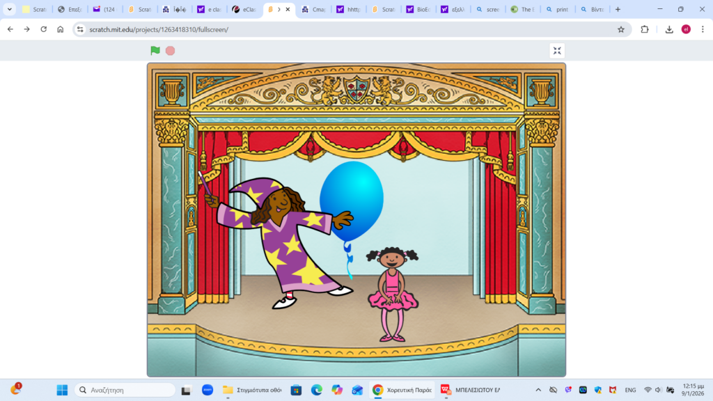 Οι μαθητές της A Λυκείου παρακολούθησαν μια παράσταση στο θέατρο που περιελάμβανε και χορευτικά δρώμενα και το scratch που δημιουργήθηκε περιλαμβάνει στιγμιότυπα απο τα δρώμενα.