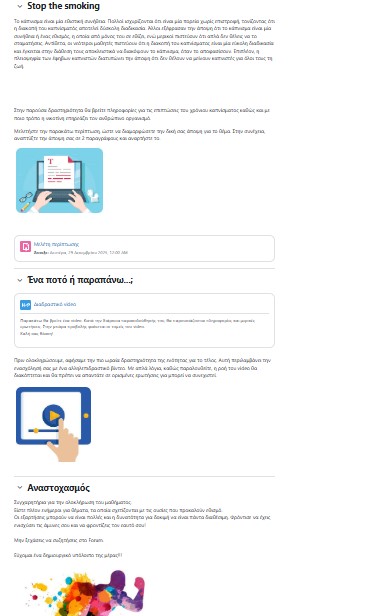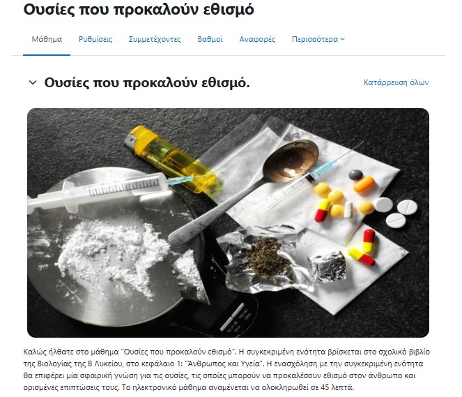 Στο πλαίσιο του μαθήματος “Ψηφιακός μετασχηματισμός-Νέες τεχνολογίες στην διδακτική των βιολογικών επιστημών”, δημιούργησα ένα διαδικτυακό μάθημα για τις ουσίες που προκαλούν εθισμό. Παρακάτω, μπορείτε να δείτε μερικές εικόνες από το διαδικτυακό μάθημα.