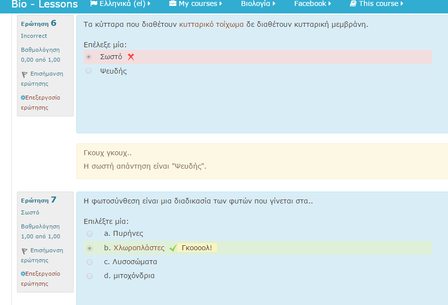 Για το κλείσιμο της ενότητας επέλεξα να δημιουργήσω ένα κουίζ ώστε να αξιολογηθούν οι γνώσεις που απέκτησαν οι μαθητές. Η πλατφόρμα δίνει τη δυνατότητα επιλογής από πολλούς τύπους ερωτήσεων όπως σωστό-λάθος, συμπλήρωσης κενού, πολλαπλής επιλογής κ.α. Ένα από τα πιο σημαντικά στοιχεία της πλατφόρμας είναι ότι επιτρέπει την ανατροφοδότηση, δηλαδή ο εκπαιδευτικός μπορεί να εισάγει σχόλια στις απαντήσεις των κουίζ (αν είναι σωστή ως επιβράβευση, αν είναι λάθος για να εξηγήσει το σωστό) αλλά και μέσω φόρουμ συζητήσεων και μηνυμάτων να λύνονται άμεσα οι απορίες των μαθητών/τριων.