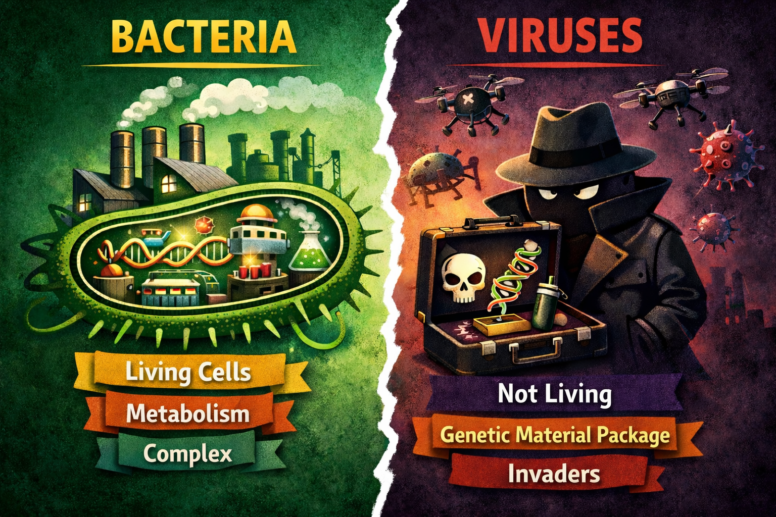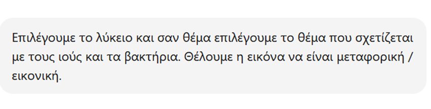 Στα πλαίσια του μαθήματος “Ψηφιακός Μετασχηματισμός και Νέες Τεχνολογίες στη Διδακτική των Βιολογικών Επιστημών” δημιούργησα μία εικόνα η οποία συγκρίνει τα βακτήρια με τους ιούς. Η εικόνα εστιάζει σε δομικές και λειτουργικές διαφορές μεταξύ των δύο κατηγοριών μικροοργανισμών. Παρακάτω παρατίθεται η σχετική εικόνα καθώς και τα prompts τα οποία χρησιμοποιήθηκαν για τη δημιουργία της.
