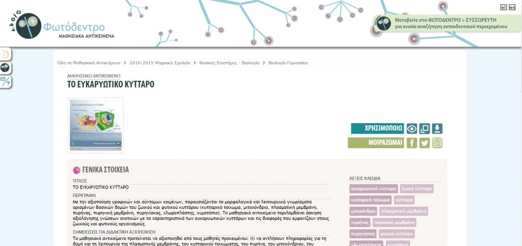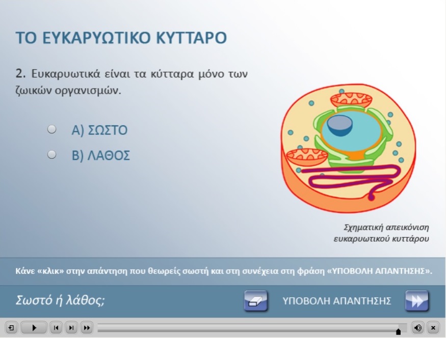 Η ψηφιακή εφαρμογή που διαλέξαμε λέγεται «ΤΟ ΕΥΚΑΡΥΩΤΙΚΟ ΚΥΤΤΑΡΟ». Η εφαρμογή αυτή ουσιαστικά είναι ένα κουίζ που περιλαμβάνει 10 ερωτήσεις σωστού λάθους. Με την αξιοποίηση γραφικών και σύντομων κειμένων, παρουσιάζονται τα μορφολογικά και λειτουργικά γνωρίσματα ορισμένων βασικών δομών του ζωικού και φυτικού κυττάρου (κυτταρικό τοίχωμα, μιτοχόνδριο, πλασματική μεμβράνη, πυρήνας, πυρηνική μεμβράνη, πυρηνίσκος, χλωροπλάστης, χυμοτόπιο). Το μαθησιακό αντικείμενο περιλαμβάνει άσκηση αξιολόγησης γνώσεων σχετικών με τα χαρακτηριστικά των ευκαρυωτικών κυττάρων και τις διαφορές που εμφανίζουν στους ζωικούς και φυτικούς οργανισμούς.
