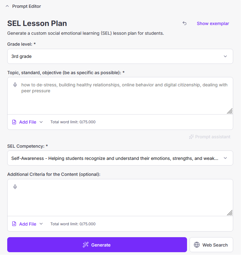 Το SEL Lesson Plan έχει ειδικά προκαθοσρισμένα πεδία (κάποια υποχρεωτικά, κάποια όχι) στα οποία εισάγεις τα prompts, όπως φαίνεται στην παρακάτω εικόνα. Τα 3 υποχρεωτικά πεδία είναι η επιλογή της τάξης για την οποία προορίζεις το μάθημα που θα παραχθεί, το θέμα – στόχος και ποιον από τους 5 άξονες της Κοινωνικής και Συναισθηματικής Μάθησης θέλεις να καλλιεργήσεις. Το 4ο και προαιρετικό στη συμπλήρωση πεδίο (το οποίο καλό είναι να συμπληρωθεί ως επιπλέον prompt) είναι τα επιπλέον κριτήρια για το παραγόμενο περιεχόμενο που θα ήθελες να εφαρμοστούν. Στα πεδία που καταχωρείται το θέμα-στόχος και τα επιπλέον κριτήρια μπορείς να πληκτρολογήσεις ελεύθερα και υπάρχει η δυνατότητα ανεβάσματος αυτών των πληροφοριών μέσω αρχείου.