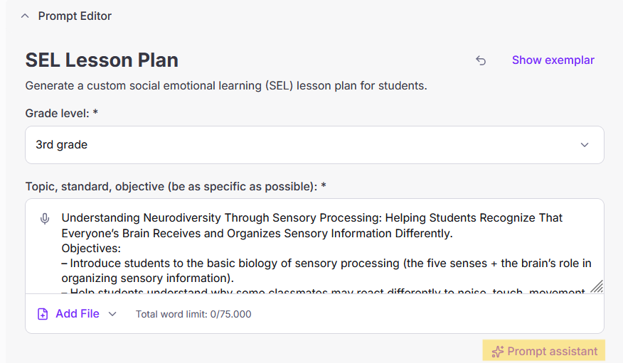 Όπως κάθε εργαλείο AI, το SEL Lesson Plan χρειάζεται τα κατάλληλα prompts για να είναι πλήρως αποδοτικό. Τα prompts είναι οι εντολές, οι ερωτήσεις και οι περιγραφές που δίνουμε στα εργαλεία AI για να δημιουργήσουν ένα αποτέλεσμα. Υπάρχει ολόκληρη θεωρία για το πώς πρέπει να είναι δοσμένα τα prompts, η οποία είναι ταχύτατα αναπτυσσόμενη. Ένας περιορισμός είναι ότι τα εργαλεία του MagicSchool είναι περισσότερο αποδοτικά στην αγγλική γλώσσα. Επομένως, χρειάζεται καλή γνώση αγγλικών από πλευράς του χρήστη ή καλή μετάφραση των prompts και του παραγόμενου περιεχομένου. Έτσι, του μίλησα κι εγώ στα αγγλικά ζητώντας του να φτιάξει ένα υποθετικό πλάνο μαθήματος Κοινωνικής και Συναισθηματικής Μάθησης, ενδεικτικά για τη Γ’ Δημοτικού.