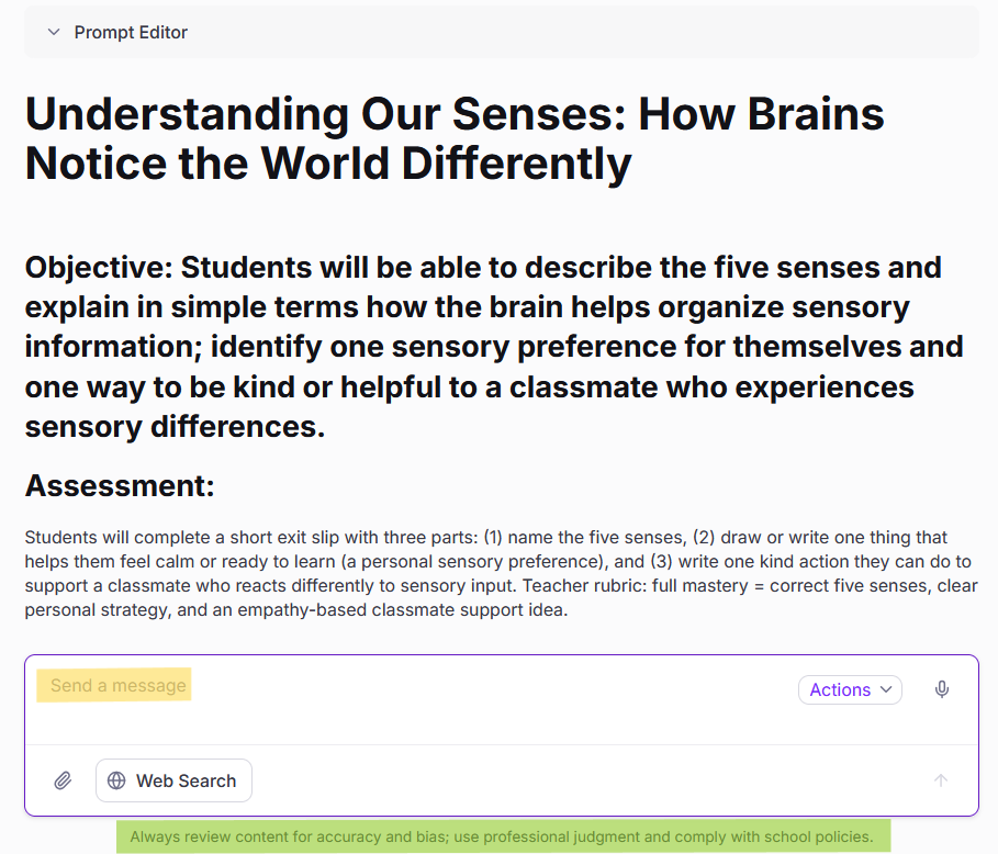 Επιπλέον, υπάρχει πεδίο στο οποίο μπορείς να συζητήσεις με το εργαλείο για περαιτέρω ανταλλαγή απόψεων και να δώσεις νέα prompts. Στην παρακάτω εικόνα, αποτυπώνεται αυτό το πεδίο με κίτρινη υπογράμμιση και με πράσινη υπογράμμιση διακρίνεται μια σημαντική προειδοποίηση που δίνει το εργαλείο στον χρήστη: “ΠΑΝΤΑ ΠΡΕΠΕΙ ΝΑ ΕΛΕΓΧΟΥΜΕ το παραγόμενο περιεχόμενο για εγκυρότητα και προκατάληψη – ειδικά οι εκπαιδευτικοί πρέπει να χρησιμοποιούν την επαγγελματική τους κρίση και να συμμορφώνεται με τις σχολικές πολιτικές”. Αυτό είναι κάτι που πρέπει να έχουμε πάντα στο μυαλό μας όταν χρησιμοποιούμε εργαλεία τεχνητής νοημοσύνης.