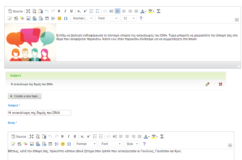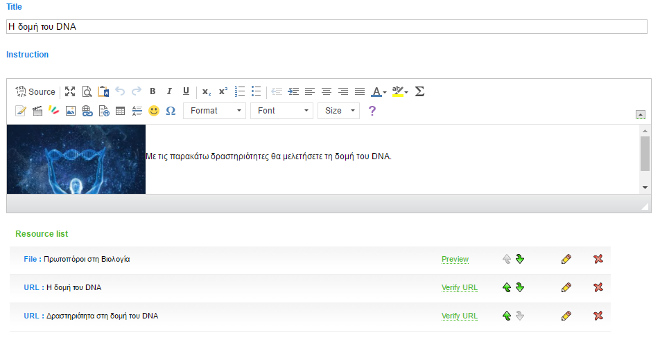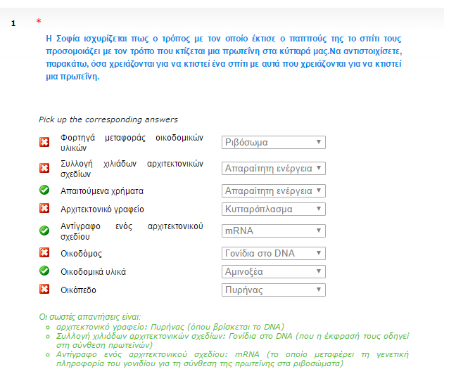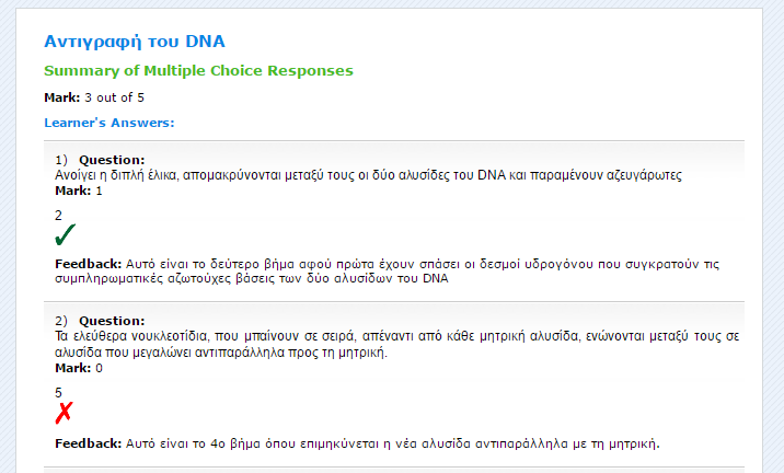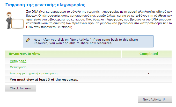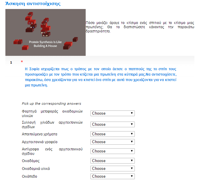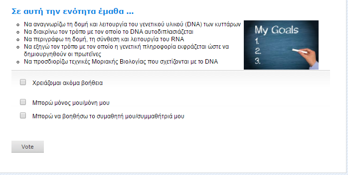 Οι μαθητές/μαθήτριες επεξεργάζονται πηγές πληροφοριών, όπως αρχεία pdf, οπτικοακουστικά υλικά, εκπαιδευτικά βίντεο. Εκτελούν διαδραστικές ασκήσεις καθώς και ερωτήσεις πολλαπλής επιλογής, σύντομης απάντησης, αντιστοίχισης, όπου τους παρέχεται η κατάλληλη ανατροφοδότηση. Επίσης συμμετέχουν σε forum συζητήσεων όπου μοιράζονται τις απόψεις τους για διάφορα θέματα. Στο τέλος κάνουν μια αυτοαξιολόγηση του τι έχουν κατακτήσει και αν χρειάζονται περισσότερη βοήθεια.